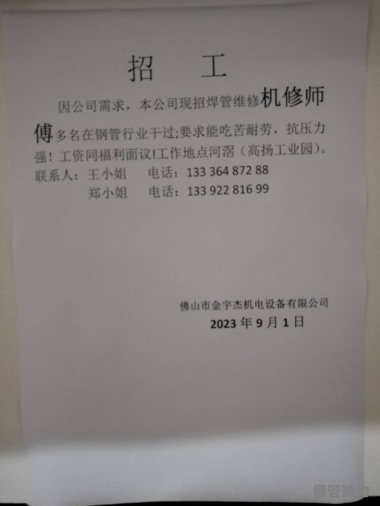 招聘刮调师傅一名,出穿线管,悬臂 50 机组。20 圆镀锌带 0.7-1.5 常年有活...